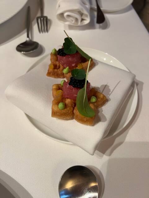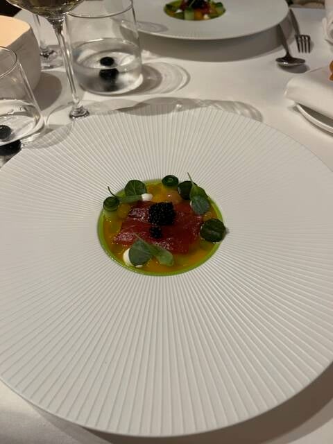 The first dish of the evening was raw tuna in a mandarin and sanbaizu dressing, which made the dish incredibly tasty. The plate was also beautifully presented, almost too beautiful to eat. In addition to this dish, a kind of savory churro was served with raw tuna and herring eggs on top. This dish was perfect to start with—a light dish with explosive flavor combinations and perfectly tender tuna.