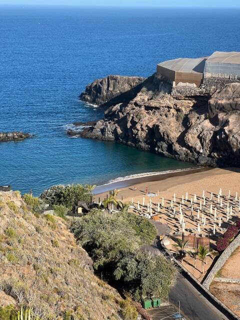 Playa de las Teresitas is a sandy beach with delightful blue water. There are many boats in the water, providing a pleasant view. In the middle of the day, it can get quite busy, but not overly crowded, so there are plenty of beach beds available. Two beach beds and a parasol cost just a little over 6 euros in total. At the beach bars, they sell delicious mango and strawberry mojitos for 7 euros each. You can park for free near the beach, but be cautious of scammers claiming it costs 2-3 euros per day.
